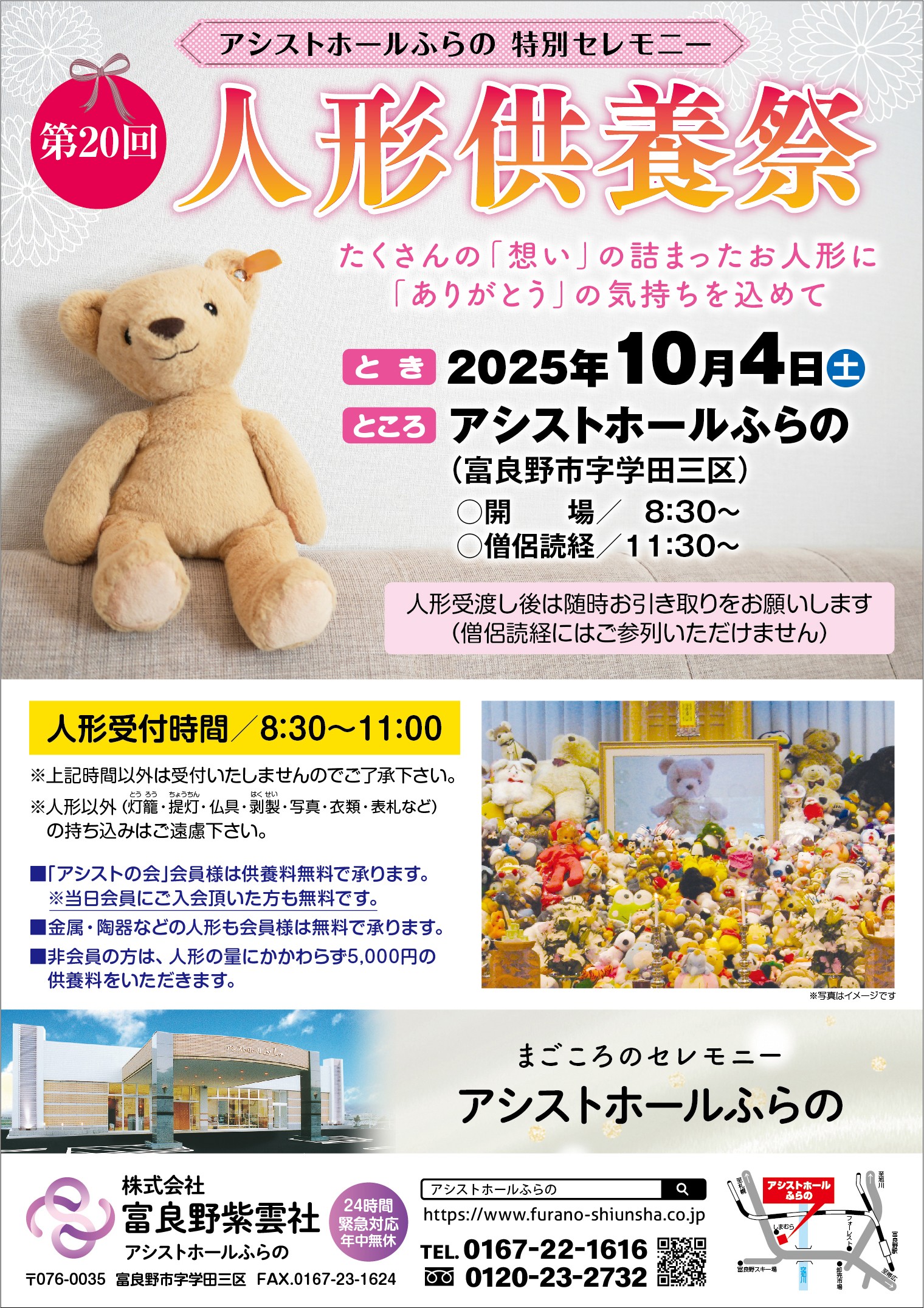 「アシストホールふらの特別セレモニー第20回人形供養祭」を2025年10月4日(土曜日)に開催します。(今年も人形供養のみの実施です。)人形受付時間は8:30~11:00です。アシストの会 会員様は供養料無料詳しくは画像をご覧下さい。